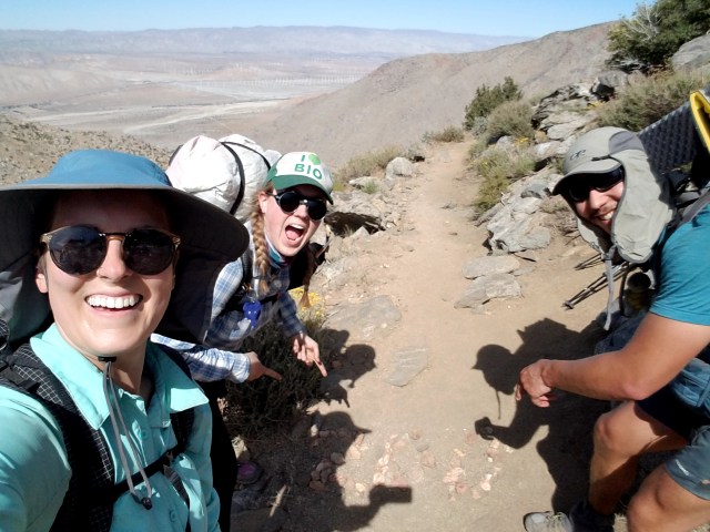 I was immediately dripping with sweat and I had to walk a lot slower than normally, feeling as though I was overheating. Gobuke and I stopped at a sign that said “Water and shade,” but it looked more like “Promised land” to me. After cold (COLD!) water and a rest, we continued up a long and steep hill, over which was an amazing view of the San Bernadino Mountains. Johanna and I got to camp after dark and were rewarded with actual toilets at the campsite. Sweet bliss.