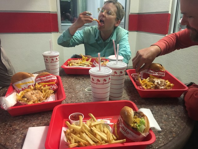 At the end of it, my feet, knees, and shoulders were loudly protesting. We laid on the ground at the bottom of the mountain and I vowed to never walk again. About an hour later, I was running to meet an Uber to take us to In-N-Out for burgers, fries, and shakes. We scared the driver, calling her out to the desert and running out of the darkness at her. I was surprised that she didn’t drive away, because she said she thought we were going to murder her. That’s job dedication for you. After gorging ourselves, we took another Uber back to camp. I cowboy camped that night (slept in sleeping bag with no tent) and the stars were amazing. Ups and downs. And ups again.