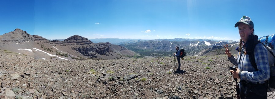 Our next resupply point marked the end of the “hard part” of Sierra Nevada. We would be done with the long stretch of 10,000 and above passes, most of the snow, and the heavy bear canisters! The landscape was changing. Sonora Pass lay between us and milkshakes, showers, and beds. It was different from anything else I’d seen on trail. The rock formations were irregular, the rock was red, and loose scree dominated a lot of the trail. There was a small patch of snow where we crossed a saddle. On the other side, the mountains were blanketed in green. Looking back, the mountains were gray, angular, and snow covered. We continued along a ridgeline for miles. As we approached the actual pass, we started passing butterflies travelling in the opposite direction along the trail. They increased in number until we were walking by hundreds of orange, black, and brown butterflies. We crossed over a flat area into strong wind. There, the butterflies were struggling against the wind and being blasted back, in a huge, revolving dance. This was and remains the most magical moment of the entire trail. How lucky were we to be passing this migration at that exact moment?