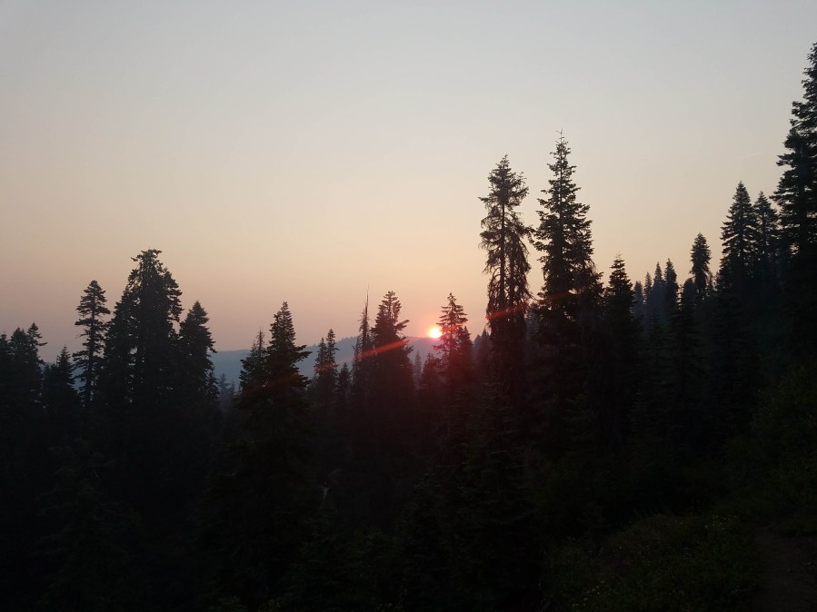 The next day, we got breakfast at the Blackberry Patch, then the lady from the hotel gave us a ride back to trail. It wasn’t too long before we reached Burney Falls and its wonderfully cool general store, where we got ice cream and soda before heading down to the actual falls. We sat by the water and stuck our feet in. It was a brisk 48 degrees Fahrenheit and the air felt refrigerated by it. We dawdled there so it took us until 8:30 to get to our campsite that night, after everyone had already gotten into their tents (remember, hiker midnight is 8:00 pm). We had dinner in the dark and went to bed for a 3:45 wakeup call, trying to be as silent as possible. We were not messing around with the heat anymore. We did 17 miles before lunch, when I had an amazing nap. Lunch became a strategic game of figuring out where the best shade was and where it would move to in the next hour. I lost every day on this stretch and had to scoot over once the shade moved off of me. On one of the afternoons, Tinkle became the first of our party to faceplant on trail! I heard her fall and turned around to see her, face in the dirt. She looked like a badass after that, with a scrape on her cheek. We caught up to Samuel/Shadow on this stretch, who we’d shared a tent with at Scout and Frodo’s, the day before we started the trail! We camped with him once, and talked for a good while, reflecting on our reasons for starting the trail as a blood red sun set through the smoky atmosphere.