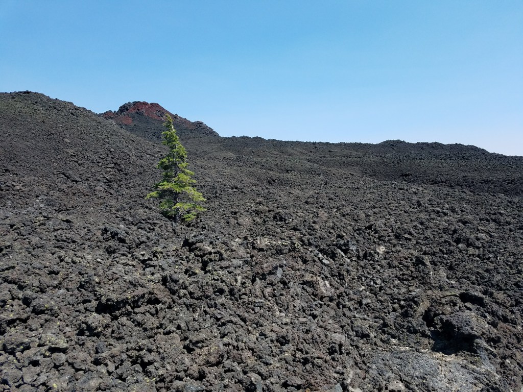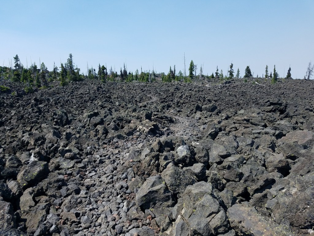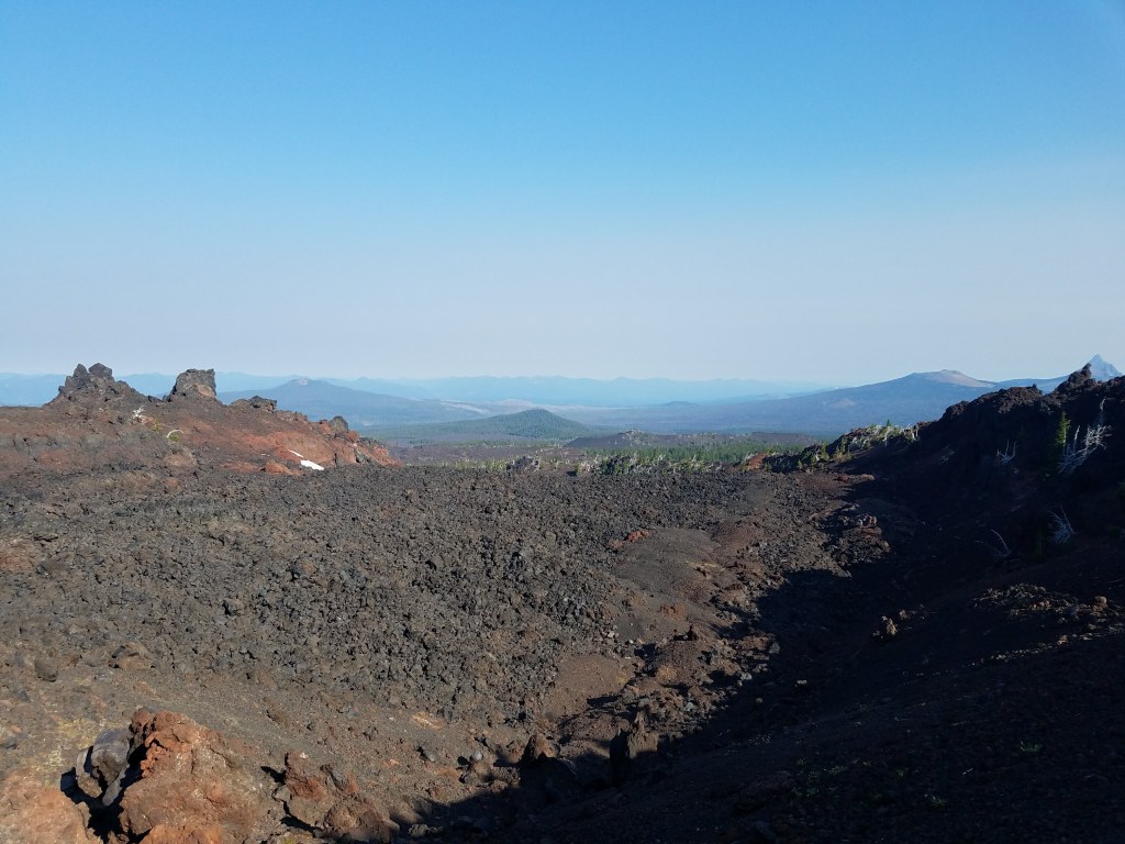 The next day, the views did not disappoint. It began with a turn around a corner to reveal the Three Sisters mountains. Next on the tour was the Obsidian Limited Entry Area, where an obsidian waterfall flowed and the hills randomly sparkled in the morning light. Around another corner was Mount Jefferson, with snow yet clinging to the top. It drew closer as I stumbled over the lava field that the trail crossed. Underfoot, the roughly circular rocks were unstable on a steep climb. At the top, surrounded by the lava, I could easily imagine myself on another planet.
