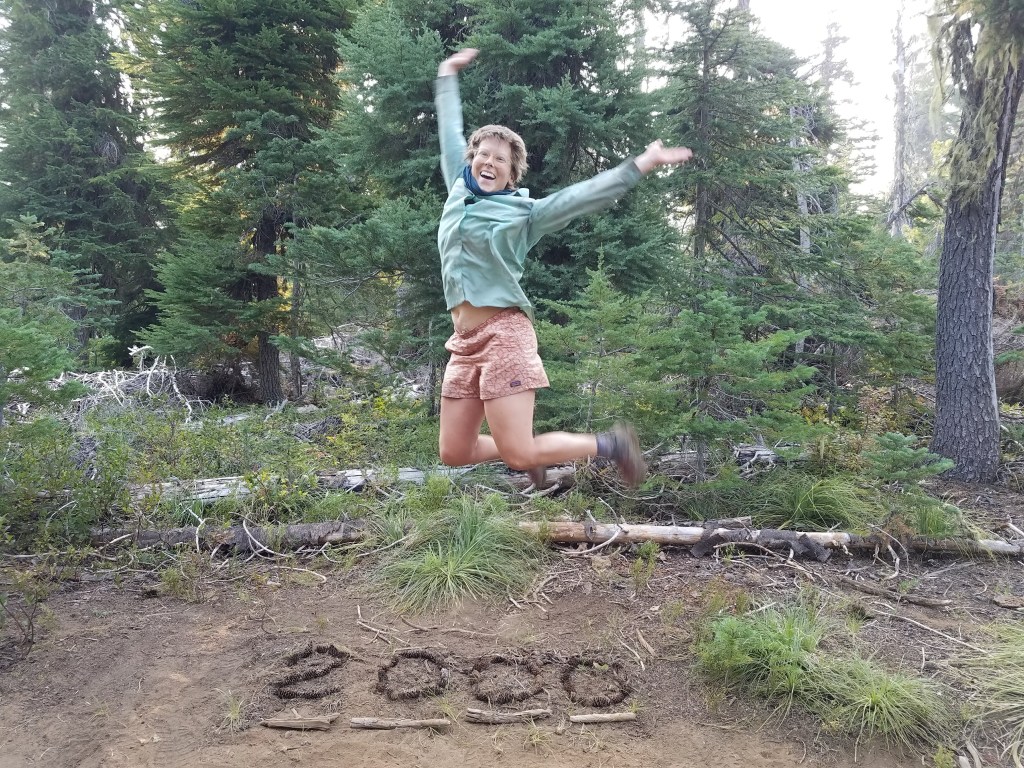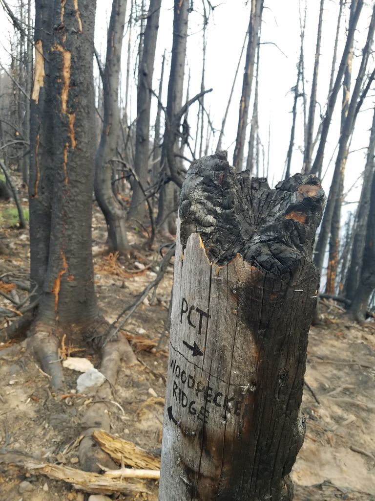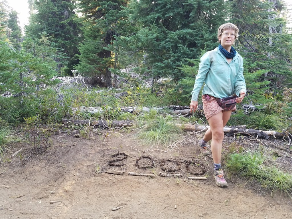 It felt very freeing to walk as far as I could go in a day, drop down, and sleep out in the open, ready to get up and start walking as soon as I awoke. That’s one of the advantages of cowboy camping, or camping without a tent. The cons were the anxiety that spiders or snakes would crawl all over you when you were sleeping or a pack of coyotes could find an easy snack. I didn’t cowboy camp very often (I think only three or four times in total), but that night I did, waking frequently to watch shooting stars and listen to the coyotes yipping in the distance. Hence the fear of becoming dog food. I got up with the sun at six to see a “No Camping” sign about 30 feet away that I’d missed in the dark. Whoops. I left early, having slept in my clothes, and walked a short mile to the 2000 mile marker!! To mark the occasion, I just wrote “Crazy.” in my journal. There’s never words adequate to the experience. In the moment, it’s the same narrow strip of dirt I’d been walking on for the last 20 minutes, but a moment to which nearly four months of walking had led. I stopped to take a picture with my MacGyver’ed trekking pole tripod, then kept on walking. The next days brought many burned areas. I kept getting glimpses of Mount Jefferson through a haze. It was a very cool feeling to see the mountains growing closer and then further as I passed them, more tangible evidence of progress than the miles I kept track of on my app.