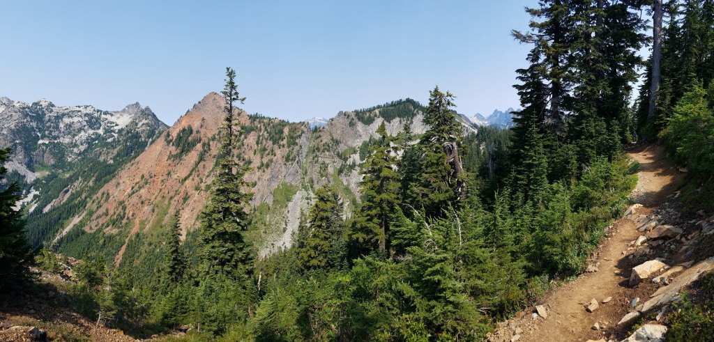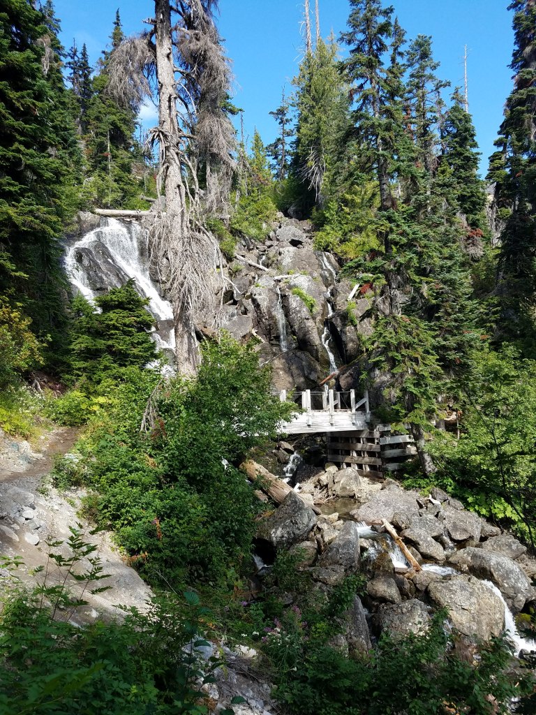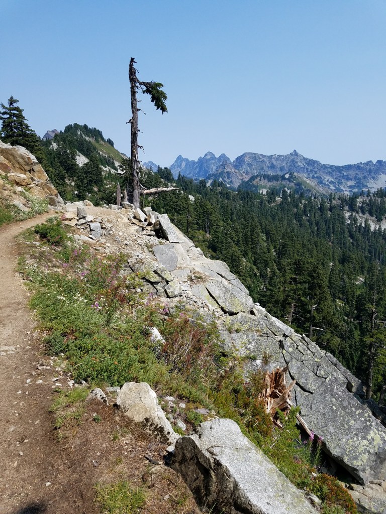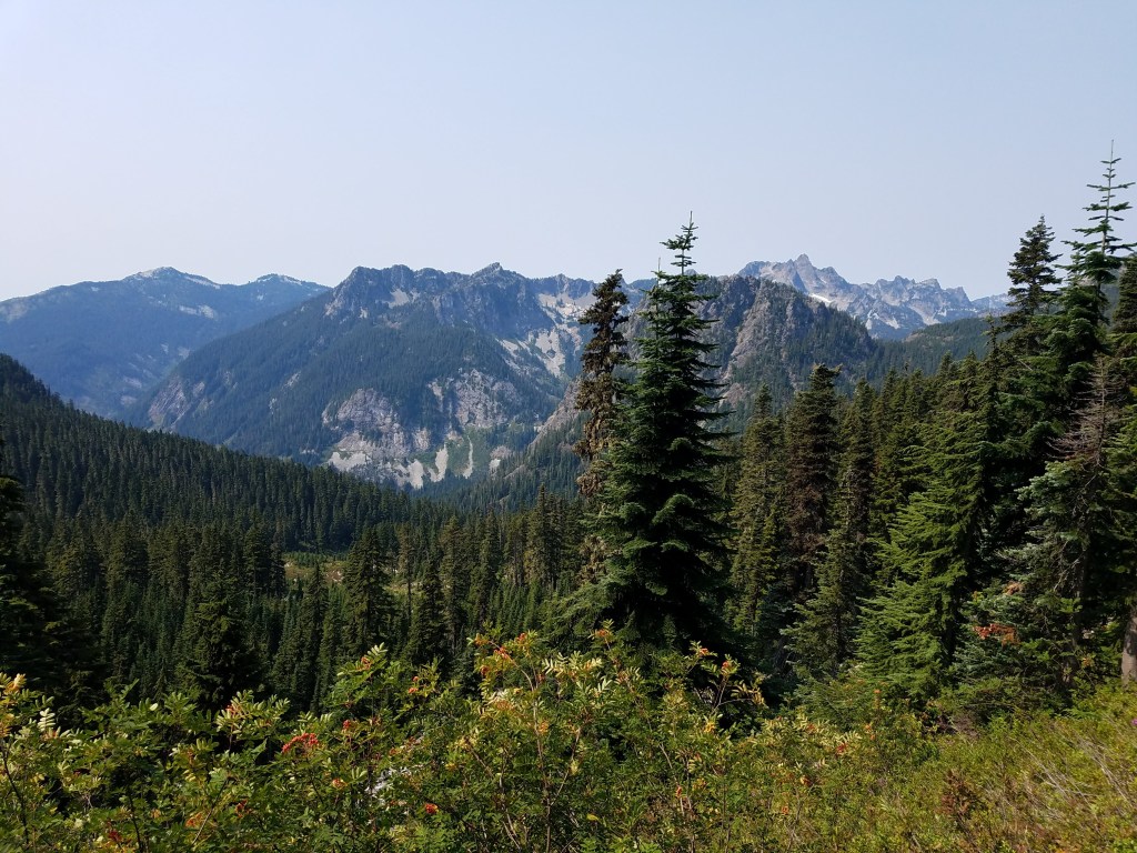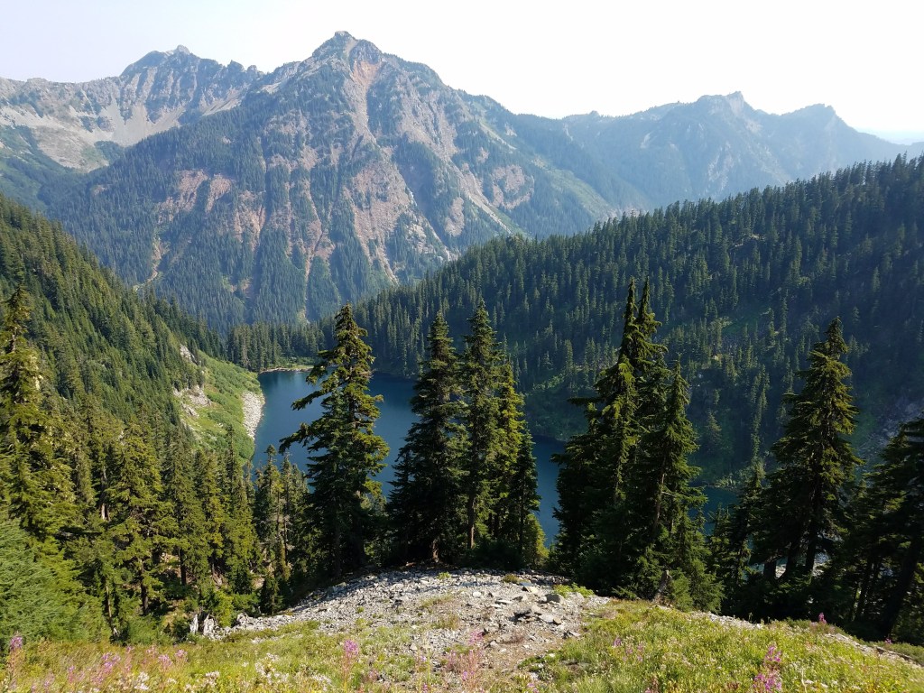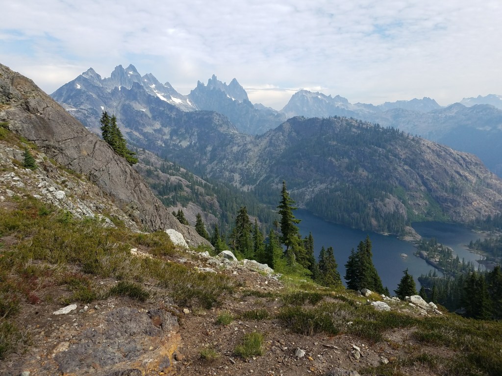 The group of hikers and I flip-flopped some more the next day, which was pretty cold and very pretty. It was my favorite day in Washington thus far, each climb revealing more mountains, more clouds, more splendor. There were a couple tough spots, including a crossing where I had to climb sharp rocks that ripped my pants and cut my leg a bit. At lunch I fell into a gear conversation with a guy named Lost. One of the advantages of trail life is that everyone you run into has a shared experience of preparing for, planning, and then actually hiking the trail, so one on one conversations are easy. I ended the day at a lake nearby a family. The kids came up to me and told me about Penelope Orangelegs, the local goose they’d named and asked me a lot of questions about hiking. After they left, I set up my tent and availed myself of the pit toilet, an open box in the woods, but a definite step above having to dig my own hole.