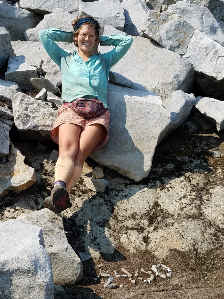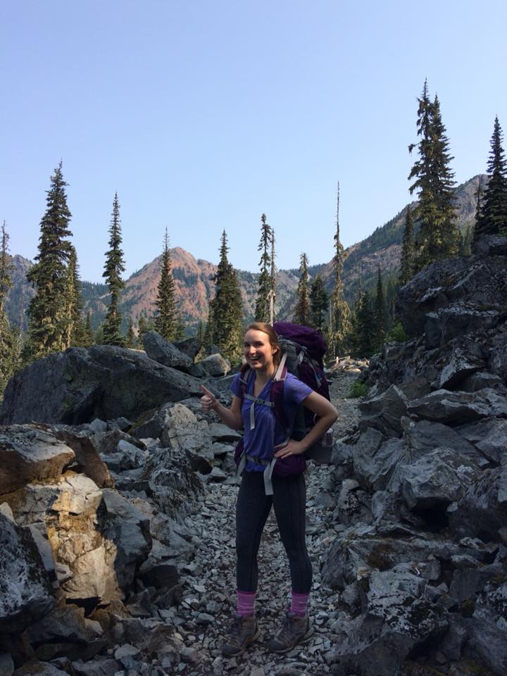 We hiked together up what I called a “big hill,” really a 2400-foot climb surrounded by pristine lakes, sheer rock walls, volcanic mountains, and white clouds. We ate lunch while we watched a dog run in and out of the small lakes below us. We hiked until the early evening and stopped to set up camp. Cassie had brought a two person tent to share, so I hiked to get water while she set it up. We stretched and ate dinner while enjoying the view down into the valley. In our sleeping bags later, we heard singing coming up the trail. Happy and Stuck on the Ground (SOTG) had caught up to us, followed by Goat Man and Pooper. They settled in to cowboy camp and we all soon fell asleep.
