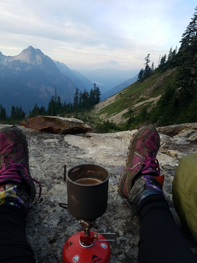 Overnight, the clouds had cleared and revealed Mount Rainier across the valley, surprising all of us. We ate breakfast with the new view and then Cassandra and I parted ways. It had been nice to have a hiking buddy again. On my own once more, I hiked up the trail to find even more views. The day brought a couple other unexpected reunions. From a guy hiking SOBO, I heard “Maddy, the nurse?” It was Paul, an Australian police officer I had shared a car with on the way to the trailhead at the border of Mexico on day one! He had flipped up north to head south and complete Washington before the snow started. It was cool to come full circle on that one. I also ran into Mosey, a lady I hadn’t seen since the desert in southern California. All day, I’d also been flip-flopping with the group of hikers we’d shared a tentsite with. We hiked together for a while and I talked to Happy and SOTG for a while about women on trail and in the outdoors in general, the Supreme Court, finishing the trail, and what life held afterward. SOTG said we probably looked weird hiking all together in a line. I said we might as well be whistling that one song. I started and everyone else followed along. Magical. We were all going to camp in the same place, but found it full already by the time we got there. They were going to cowboy camp (without tents) on a bridge, but I continued and found a flat spot to set up.