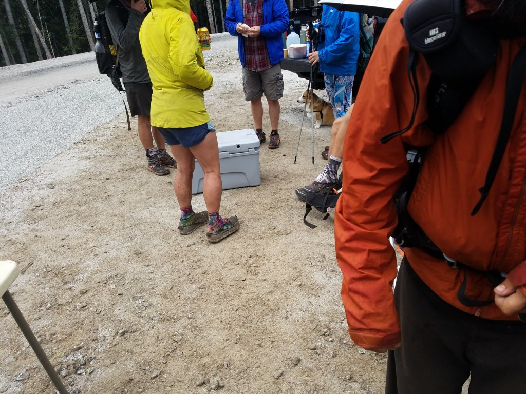 I escaped rain overnight, but as soon as I started walking the next day, the rain started falling. I only had nine miles until Stevens Pass, where I planned to stop. The nine miles were interesting. I passed under powerlines, which make a buzzing sound in dry conditions, but with the rain sounded like a waterfall overhead. I started passing day hikers and seeing ski lifts as I drew closer to the pass. As I walked in, a “Trail Magic” sign greeted me. Sticky Fingers’ dad was the trail angel and had brought breakfast sandwiches, coffee, beer, doughnuts, cookies, brownies, and a corgi named Roger! The best trail magic, however, was Happy’s news. The northern terminus of the trail had been closed because of forest fires. We all celebrated its opening again; we could finish the trail on the trail, now!